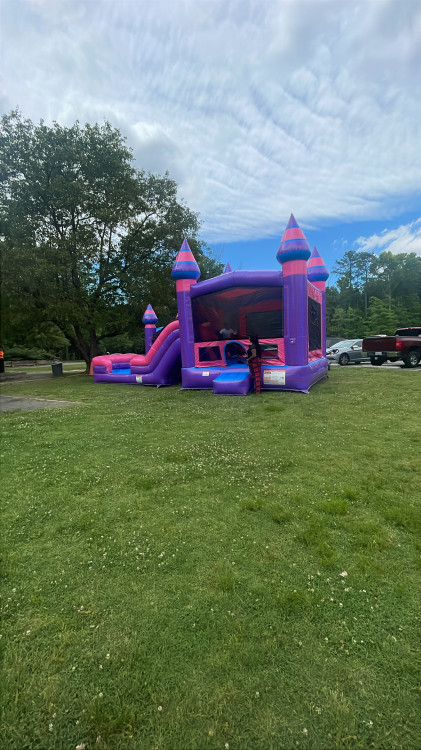 Turn your next party into the ultimate celebration with this vibrant Purple and Pink Bounce House Combo! Designed for hours of non-stop fun, this inflatable features bold, eye-catching colors and a whole world of activities to keep kids entertained. Includes dual Lane Slide, spacious bounce area, basketball hoop, and inflated splash pool!