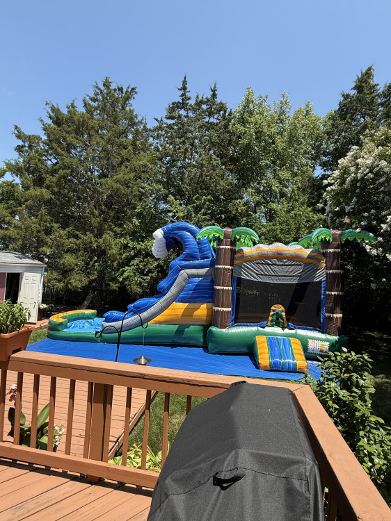 Get ready for a tropical adventure with our Palm Tree and Tidal Wave-themed bounce house! This vibrant inflatable features a slide that can be used wet or dry—transform it into a splashy water slide or enjoy a safe inflatable landing. Perfect for indoor or outdoor fun, it includes an integrated basketball hoop for extra excitement. An optional pool attachment is available upon request. Make your party a wave of fun!